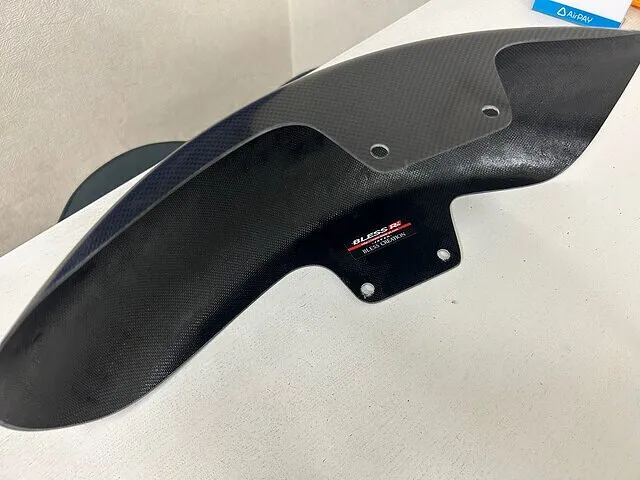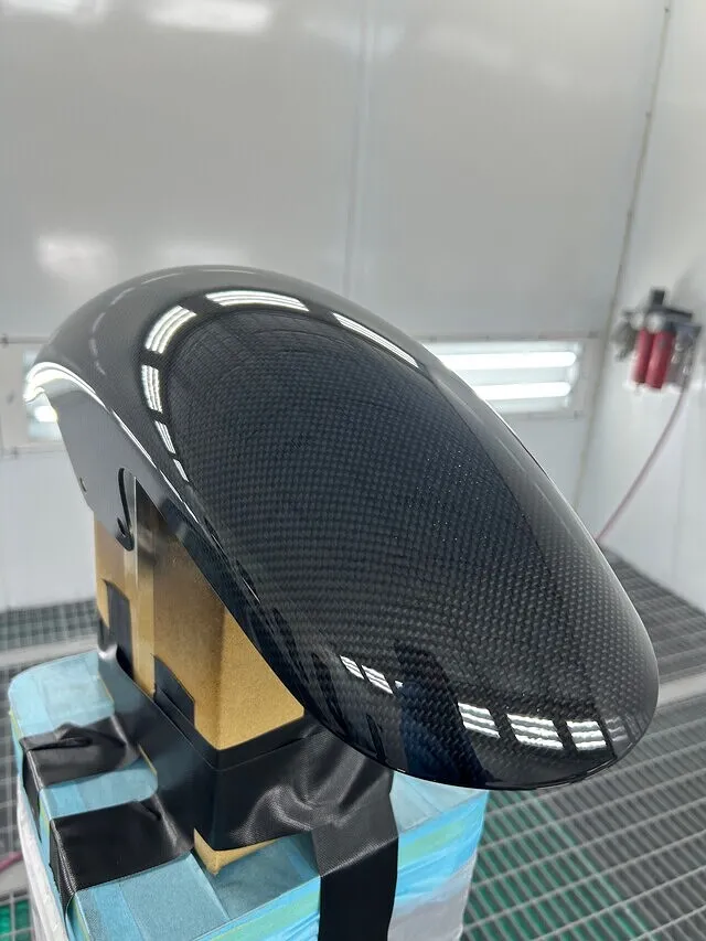 今回は、ウェットカーボン製のフロントカウルのクリヤーコートの作業依頼です。部品自体も高価ですので、長く使用できるようにバージョンアップの作業を提案させて頂きました。