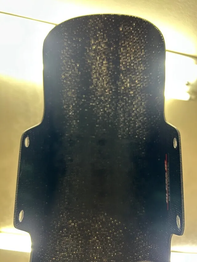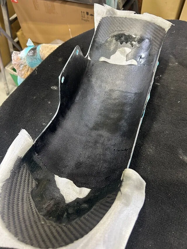 パーツは、ウェットカーボン製ですので、カーボン繊維は表面の1プライのみの製法です。石ハネなどからの強度を増すために、カーボン繊維を積層して補強致します。別作業などで、余ったカーボン繊維を使用致しますので、コストも抑えることができます。